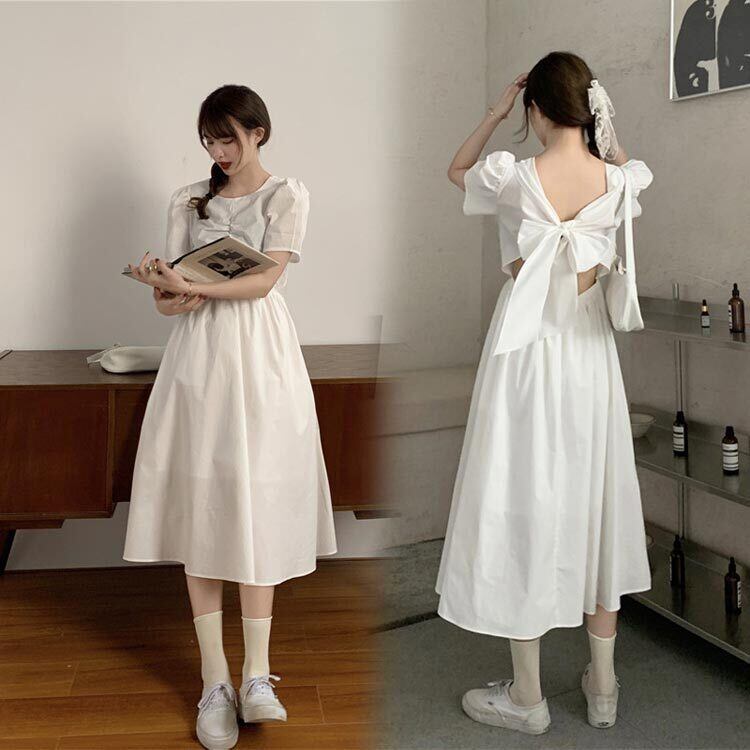 3COLOR ワンピース パフスリーブ バックレスワンピース バックレスリボン 半袖 フリーサイズ ブルー ホワイト ブラック カジュアル 大人可愛い シンプル ナチュラル レディース【送料無料】【予約商品】nc0477