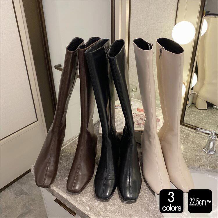 3COLOR シューズ ロングブーツ ニーハイブーツ フェイクレザー スクエアトゥ チャンキーヒール 内側ジッパー仕様 秋冬 ブラック ベージュ ライトブラウン 定番 おしゃれ ベーシック 大人可愛い シンプル カジュアル ユニセックス レディース【送料無料】【予約商品】nc0623